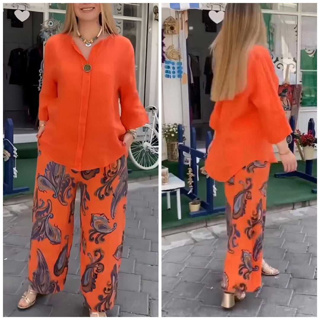 Pachetul include: Bluză cu mânecă lungă pentru femei și pantaloni cu picior lat cu imprimeu casual.