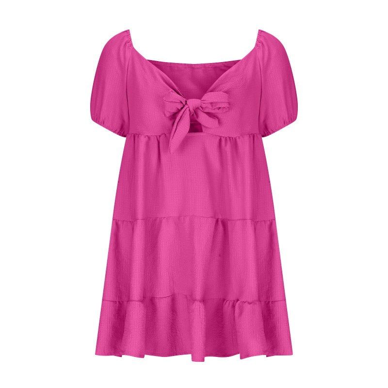 DECUPAJ ELEGANT:Cu un detaliu chic de decupaj frontal cu o fundă decorativă, această rochie adaugă o notă cochetă și atrăgătoare look-ului tău de vară.